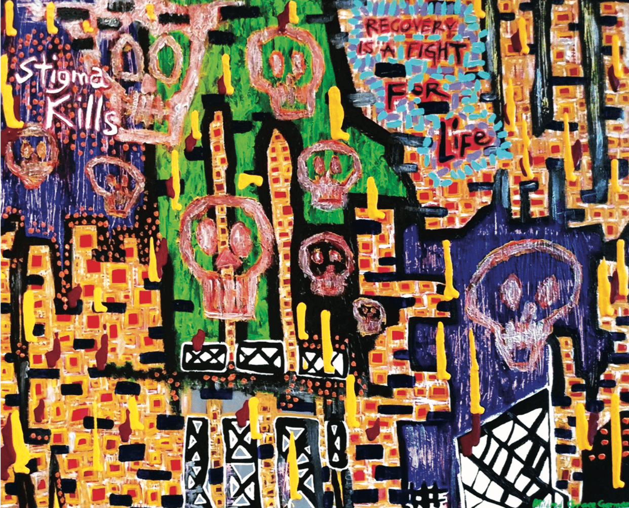 In Mildred Grace German’s piece Stigma Kills, the artist aims to depict how mental illness and addiction can affect anyone, regardless of their background or location. The artwork was inspired by the ongoing battle for social justice in Vancouver’s Downtown Eastside, where German lives. The piece was on display at the University of British Columbia as part of a student art show exploring the impact of the opioid crisis from a youth perspective.