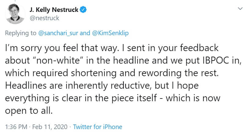 Nestruck acknowledges that the use of “non-white” may have been incorrect, and the Globe altered the title to use “IBPOC” on February 10, after much calling out on Twitter (disclosure: I played a part in this). But since the article was behind a paywall at that point, the change was only apparent in the title. On February 11, 2020, according to Nestruck, the Globe and Mail decided to remove the article from behind the paywall to reveal its new, adjusted title: “How should media respond when an artist limits reviews to critics who are Indigenous, black and people of colour?”