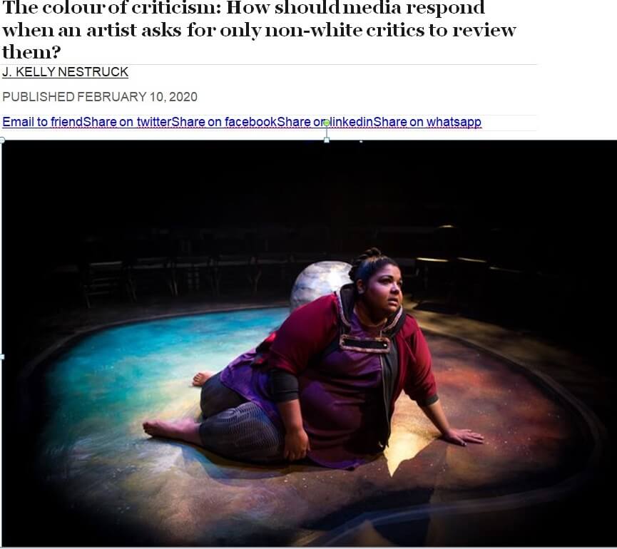 The “basic principle” that he refers to is the current status quo within mainstream cultural journalism. Taking only the example of Canada, and–to borrow Harvey’s term on Twitter, “non-IBPOC”–Canadian theatre reviewers hired and paid by “mainstream” outlets like Globe and Mail, Toronto Star, and so on, the status quo signals a lack of IBPOC reviewers not part of this mainstream. Not only does Nestruck ask to uphold the status quo, he also wonders out loud whether artists should be allowed which “colour” of critic reviews them. I wonder here, allowed by whom? And by bringing “colour” into the equation, Nestruck makes the conversation less about the politics of power (here, status quo), and more about the politics of race. In this question, he shifts the conversation from the whiteness of the mainstream media, to the racial background (indicated here by “[skin] colour”) of the requested reviewers.