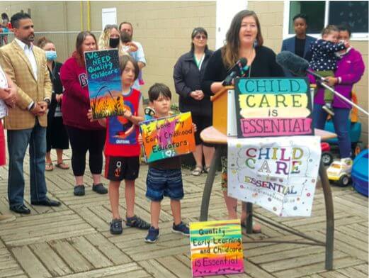 When brainstorming a name, MacIsaac says, “The messaging that kept coming through is the words ‘childcare is essential.’” So, they went with it. Through weekly Zoom meetings, they planned campaigns and activities, ultimately mobilizing community members at a rally in late August in front of the Minister of Families, Heather Stefanson’s, office.