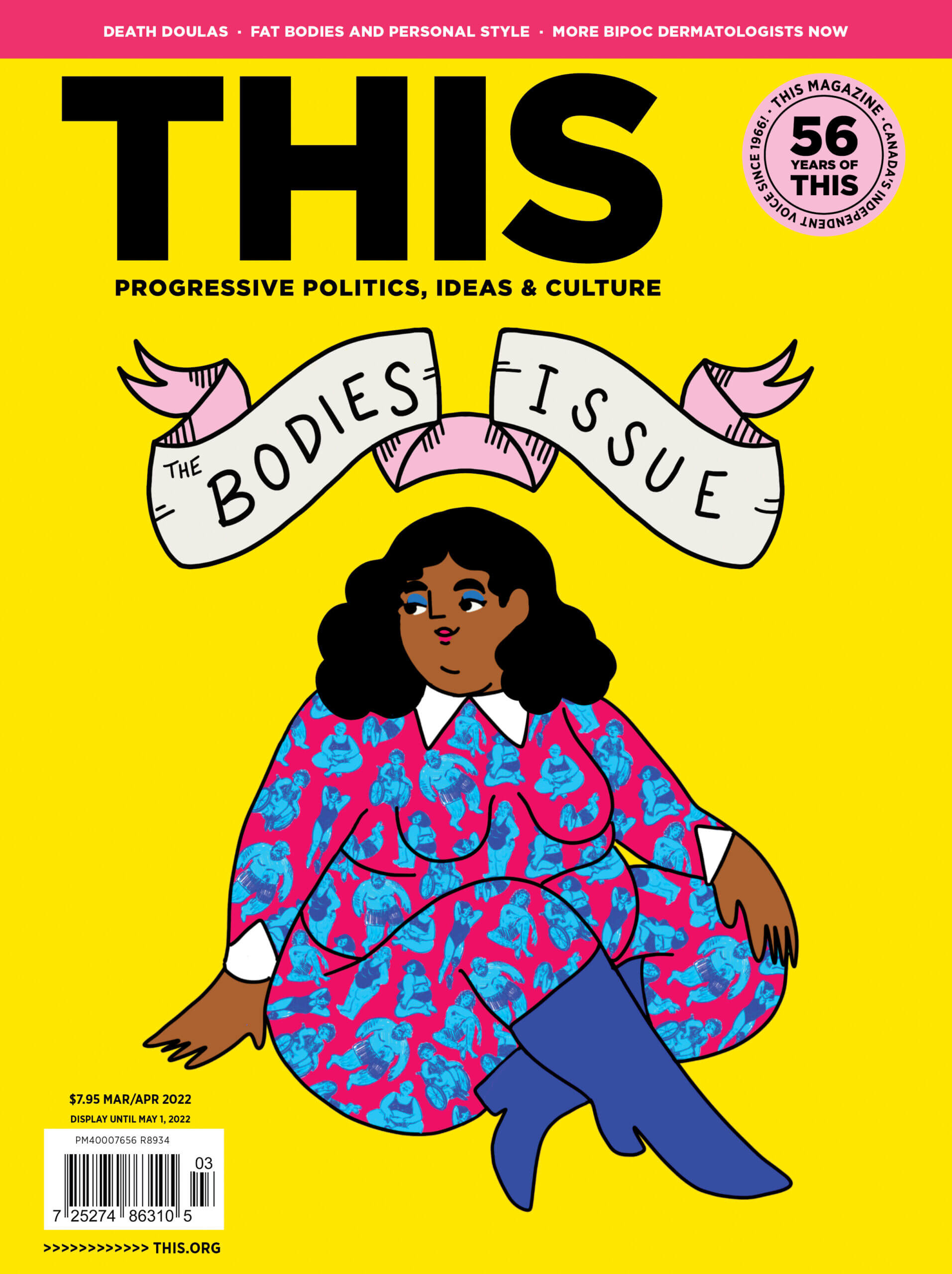 While some experiences may ring true to some readers, there’s opportunity to learn from other people’s experiences of their bodies, and their work with bodies, throughout this issue. Dorcas Marfo talks about growing up as a dark-skinned Black person with eczema, and how her experience interplays with the need for more BIPOC, specifically Black, dermatologists in Canada—and more education about melanated skin in the dermatology field. Jacqueline Salomé introduces readers to death doulas, who support people at the end of their lives and work to demystify death. Samantha Nock talks about scarcity when it comes to clothes for fat bodies, and how in her teens she was unable to really discover her personal style, or authentic self, because of this. Samantha Peters talks about new legislation that’s supposed to support judges being more educated around sexual assault. But, she argues, this framework still relies on the idea of a “perfect victim,” and might not really serve those of marginalized identities.